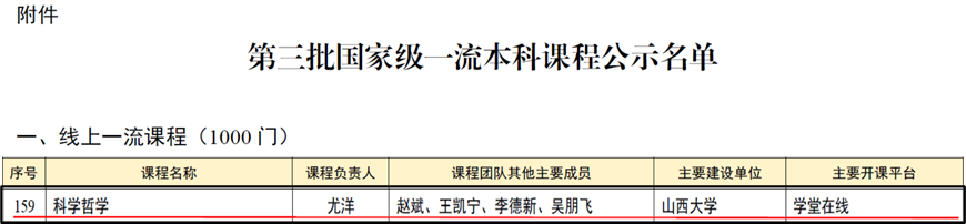 8月21日,教育部网站发布了《关于第三批国家级一流本科课程认定结果的公示》。公司尤洋教授团队申报的《科学哲学》入选第三批国家级一流本科课程(线上一流课程)。该课程于2019年正式上线学堂在线,至今已完整运行7年,线上授课13个班级。2021年该课程被认定为山西省一流课程,是伟德官方网站哲学专业核心课程之一。尤洋为该课程负责人,授课团队包括赵斌、王凯宁、李德新、吴朋飞、康仕慧、杨维恒、王亚男、何华。