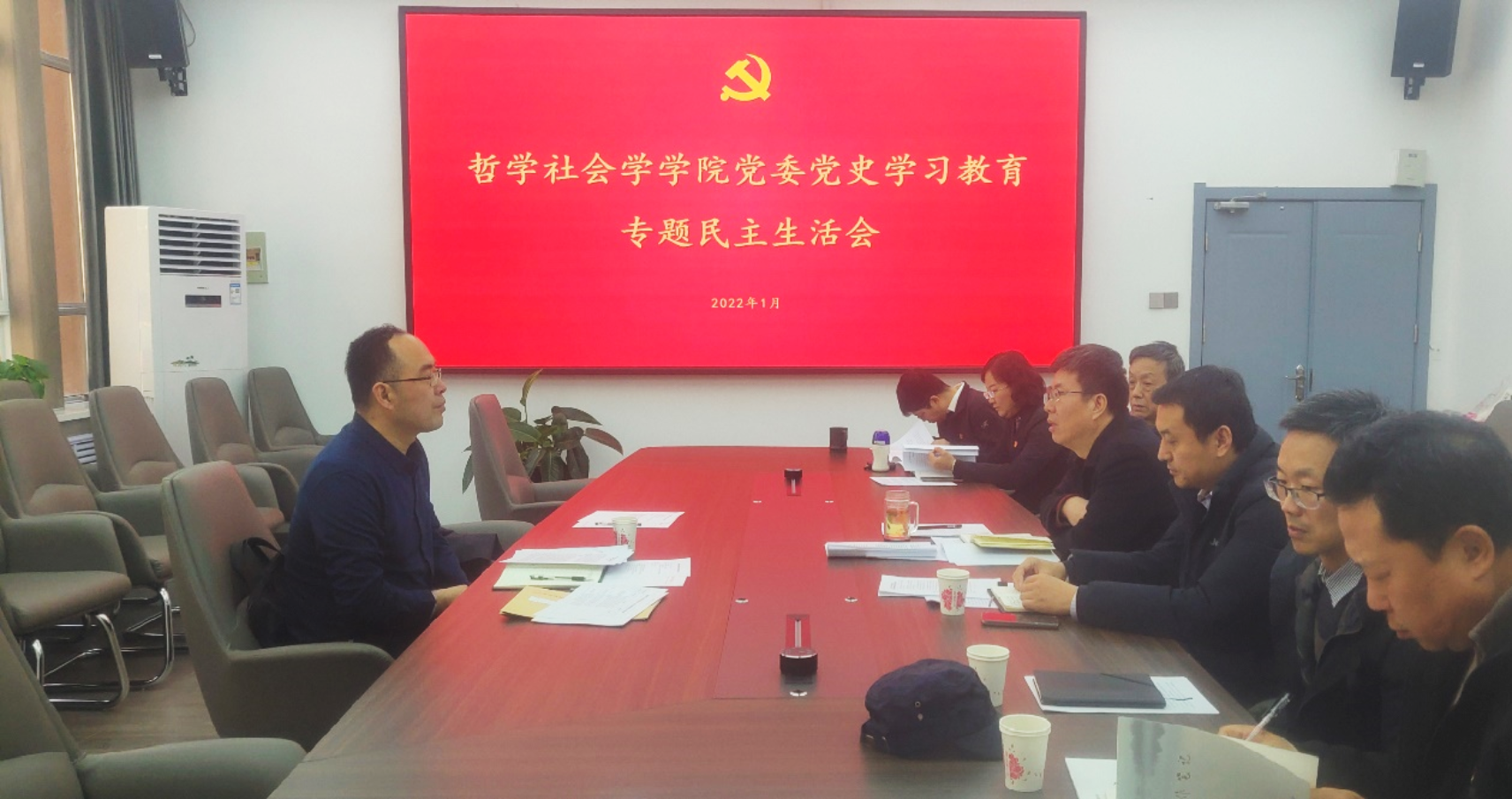 2022年1月12日,哲学社会学公司党委在公司二楼会议室召开党史学习教育专题民主生活会。校纪委副书记池卫平到会指导,公司党员领导干部到场参加,非党员领导干部等列席,公司党委书记韩树林主持会议。