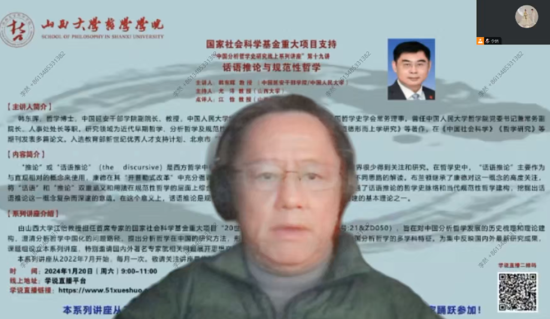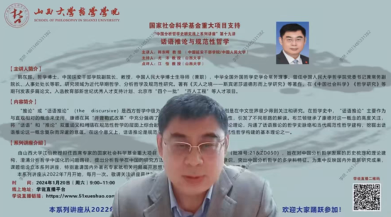 2024年1月20日,由伟德官方网站江怡教授担任首席专家的国家社会科学基金重大项目组织的“中国分析哲学史研究线上系列讲座”第19讲,特别邀请中国延安干部公司副经理、教授,中国人民大学博士生导师(兼职)韩东晖作题为“话语推论与规范性哲学”的学术报告,bevictor伟德经理尤洋教授主持,江怡教授为点评嘉宾。
