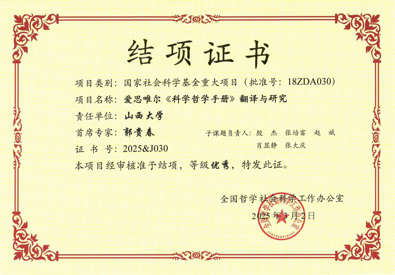 近日,由公司科学技术哲学研究中心郭贵春教授主持的国家社会科学基金重大项目“爱思唯尔《科学哲学手册》翻译与研究”(项目编号:18ZDA030)顺利通过全国哲学社会科学工作办公室结项验收,最终成果评定为“优秀”等级。